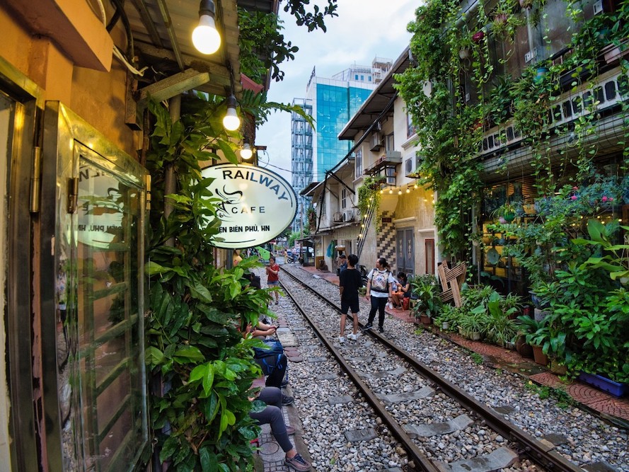 Train Streetと呼ばれる映えスポ観光地は、要するに線路です。過去に事故などがあり、本来は立ち入り禁止ですが、線路脇のお店(カフェ、バー)を利用する場合は入れちゃいます。余裕です。線路のそばには警備隊の方がおられるのですが、店主とは仲が良さそうでした。